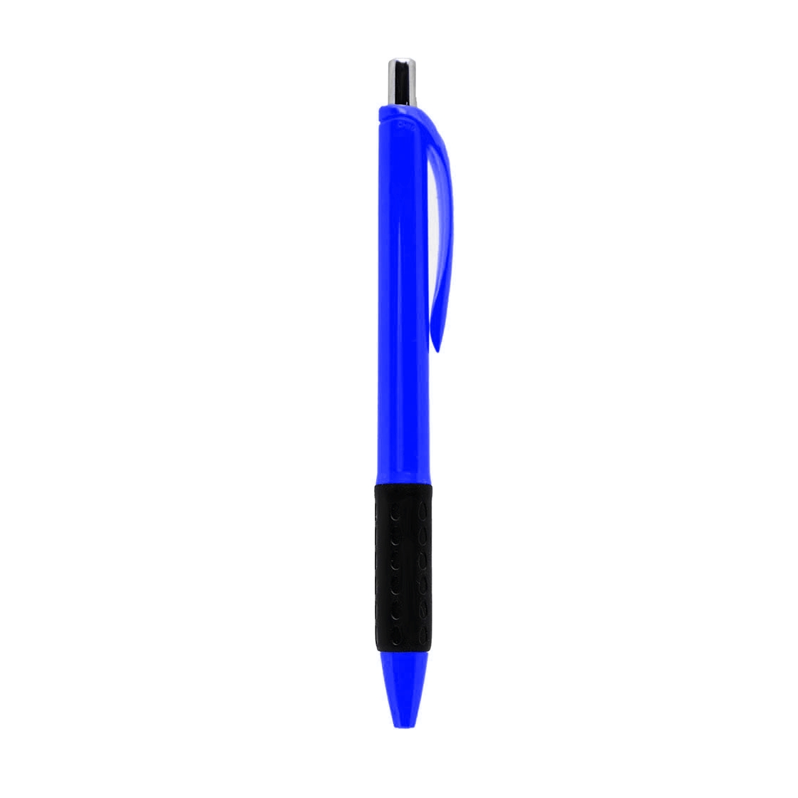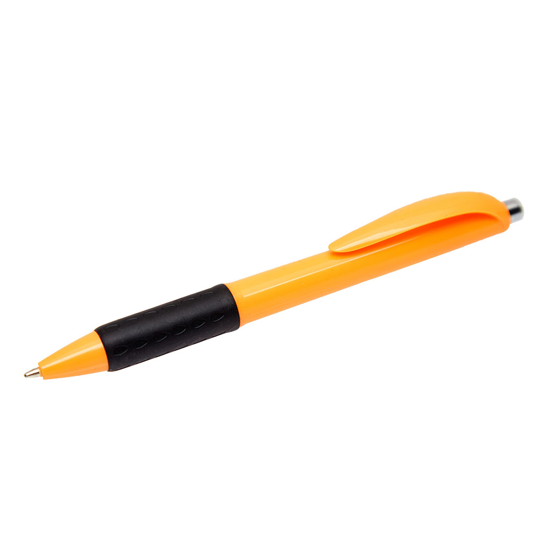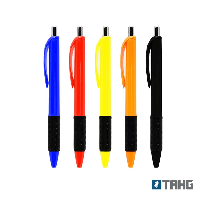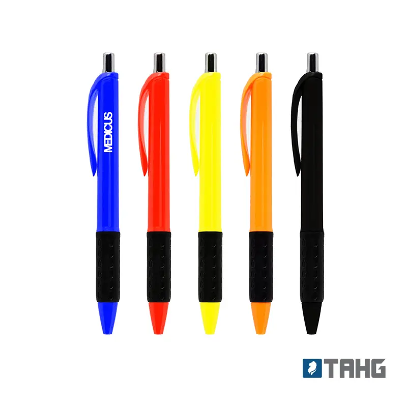 Bolígrafo con cuerpo plástico de color. Grip de goma negro. Pulsador metálico. Retráctil. Tinta negra. Producto libre de BPA. Tahg